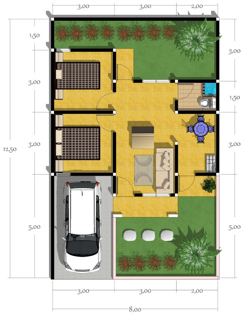 Denah Rumah Sederhana 2 Kamar Beberapa rumah minimalis biasanya hanya terdiri dari 2 ruang kamar tidur, kamar mandi, dapur, ruang tengah, dan garasi kecil. Rumah sederhana merujuk pada makna rumah dengan bentuk dan detail yang sederhana, dimana kita tidak akan menemukan banyak permainan list profil dan kanopi di sini. Denah sendiri di mulai dari sebuah teras berukuran 1.5x4 meter. Penasaran dengan gambar denah rumahnya?